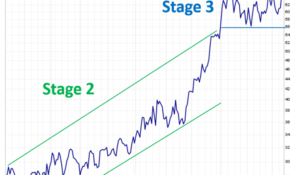 - Stage 3 (Topping): A period where the uptrend loses momentum and the stock churns as buyers and sellers reach equilibrium.