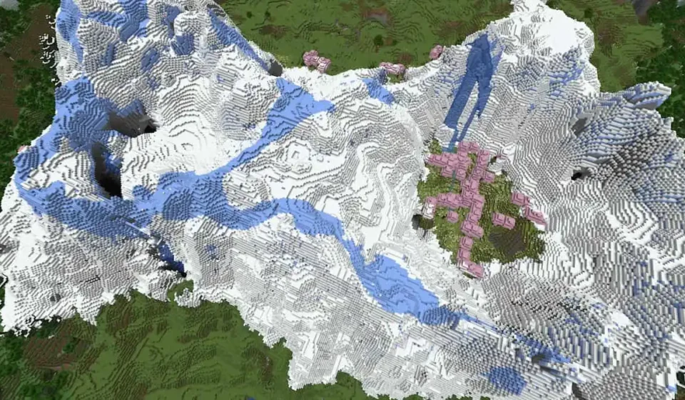 The juxtaposition of icy peaks, delicate cherry blossoms, and the foreboding presence of Ancient Cities creates a visually stunning and gameplay-rich environment. The proximity of diverse structures like villages, mansions, and shipwrecks ensures that players have ample opportunities for resource acquisition and adventurous pursuits right from the start.