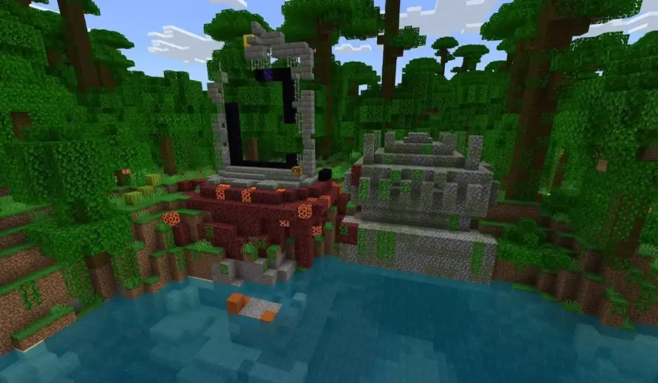 This seed is a treasure trove for aspiring archaeologists and explorers. Nestled within a Jungle biome, players will find a variety of ruins clustered around a picturesque lake. The lakeside features a prominent ruined Nether portal and a Jungle Temple. The shallow areas of the lake conceal a set of Trail Ruins, while a deeper dive reveals a small collection of Warm Ocean Ruins on the lakebed. This concentration of ancient structures provides ample opportunity for early-game loot and historical exploration.