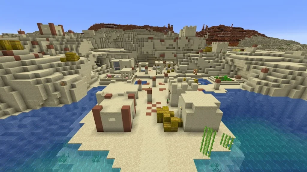 This seed places players directly in the center of a double village situated within a forest of cherry blossom trees. The village and its surrounding pink biome lie in a valley nestled between two imposing, snow-covered mountains. Combined, the two villages offer over 30 buildings, providing ample opportunities for NPC interaction and trading. Additionally, players will have access to several Ancient Cities hidden beneath the larger of the two mountains, promising extensive underground exploration.