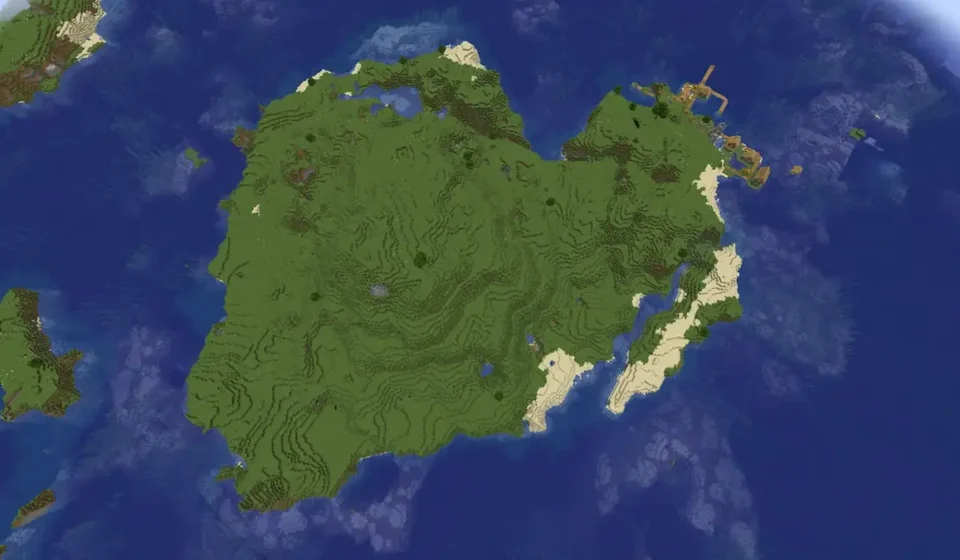 This island is unique in its composition: it is essentially a single Plains Village floating in the vast expanse of an ocean. This isolated settlement provides a self-contained starting point with all the necessities of a village readily available. The surrounding ocean holds two Ocean Monuments, one to the southeast and another to the southwest, offering challenging underwater exploration opportunities.